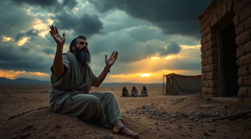 Jó. A cena ocorre na terra de Uz, figura de fronteira cultural entre Israel e os povos vizinhos. O relato apresenta um patriarca próspero que, em sequência, perde bens, filhos e saúde (Jó 1–2). O texto registra também um quadro celestial: Satanás aparece perante o Conselho divino, não como uma abstração moderna, mas como acusador que questiona a fidelidade humana. Culturamente, o gesto de sentar na cinza e rasgar roupas é marcador de luto profundo e de busca por resposta junto a Deus.