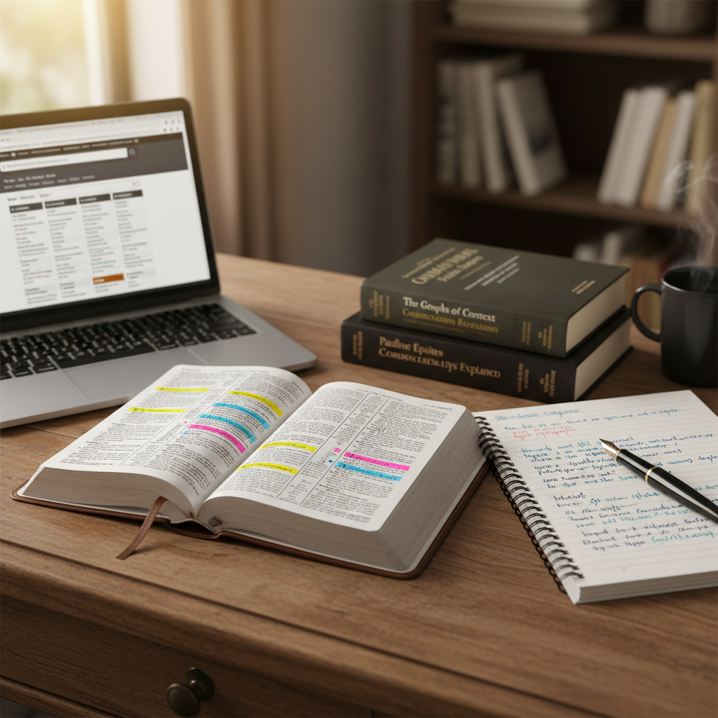 Use interlineares e concordâncias em sites como Bible Hub e Bible Gateway, além de atlas e materiais contextuais. Combine isso com comentários acadêmicos para validar interpretações.